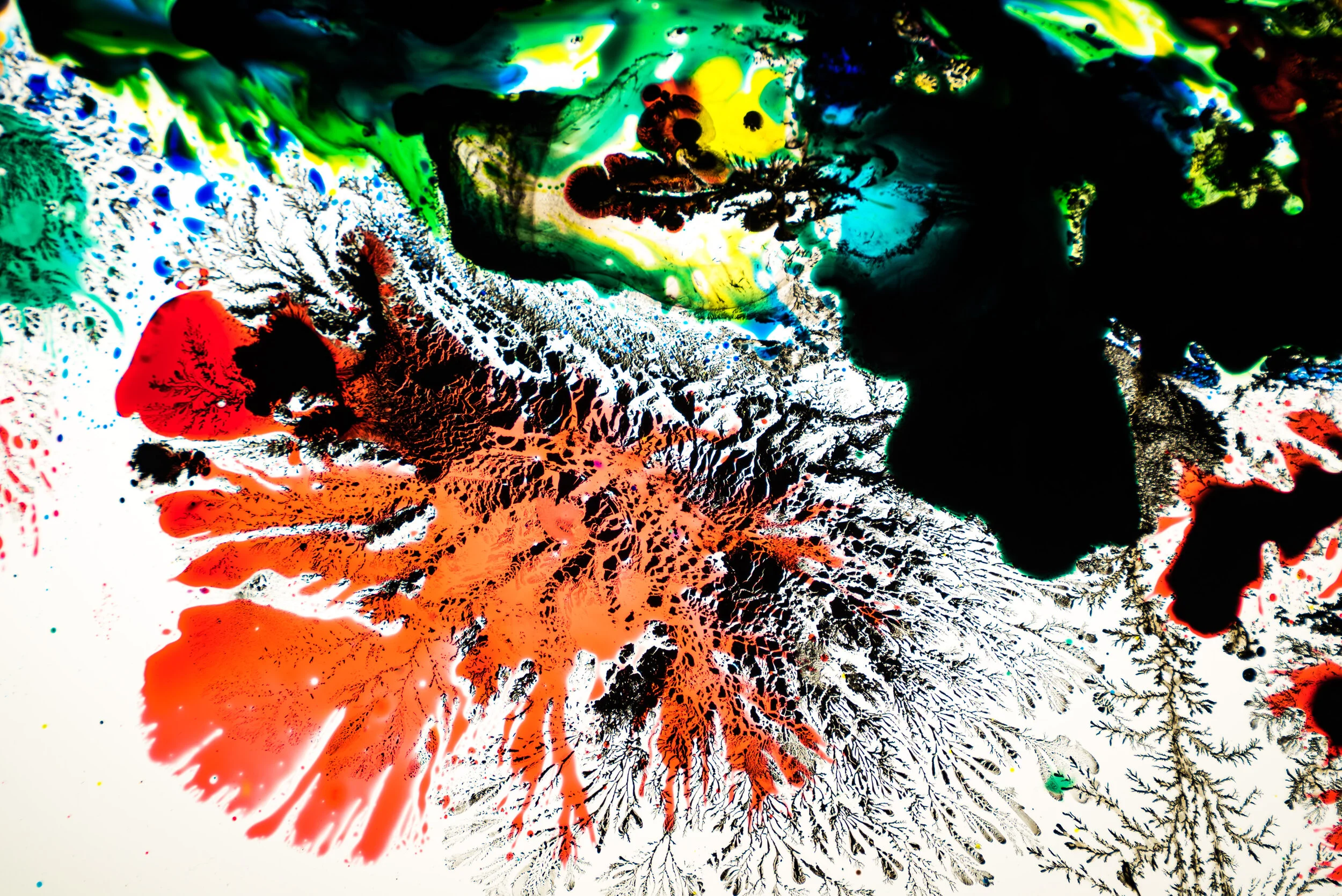 ライフゲームアルゴリズム(生命の誕生、進化、淘汰などのプロセスを再現する簡易的モデル)によって様々なインクを自律滴下し、それらが混ざり合う際に起こる、粘性樹状突起形成やマランゴニ効果など「散逸構造」の特徴を持った物理現象を利用することで、アナログならではの有機的な模様や形を描き出してゆくインスタレーション『dyebirth』。